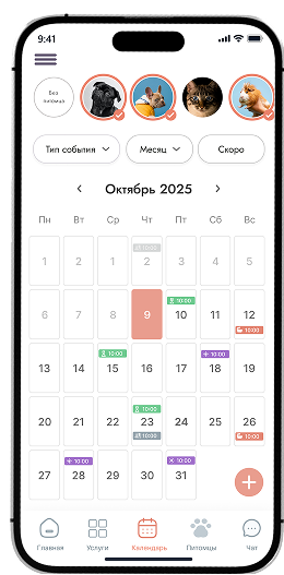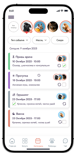 Удобная система типов событий (здоровье, питание, процедуры) позволяет мгновенно оценить предстоящие задачи. Это не просто календарь, а продуманная система заботы, которая помогает дарить питомцу больше внимания и бережет ваше время.